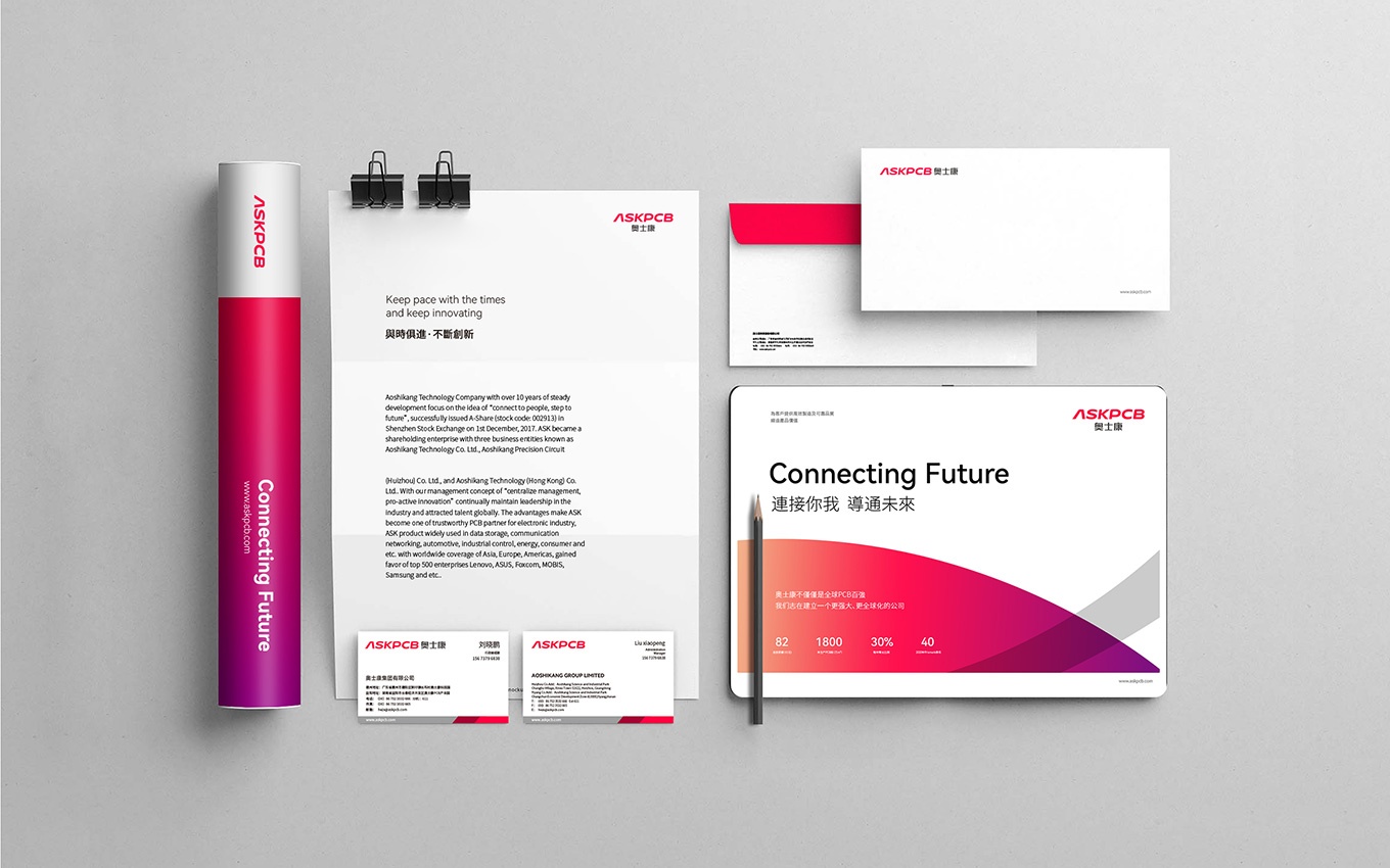 奧士康科技股份有限公司秉承連接你我,導通未來的企業使命,經過10余年的穩步發展,現已成為擁有奧士康科技股份有限公司、奧士康精密電路(惠州)有限公司、奧士康科技(香港)有限公司等三家企業經營實體的股份制企業,于2017年12月1日在深交所A股成功上市(股票代碼:002913)。奧士康秉承集權管理、民主創新的經營管理理念,依托自身優勢,吸引全球行業精英人才,持續創造行業領先業績,成為了中國乃至世界電子行業值得信賴的PCB智造商。本次合作,uci聯合創智為奧士康科技提供了上市公司vi設計。