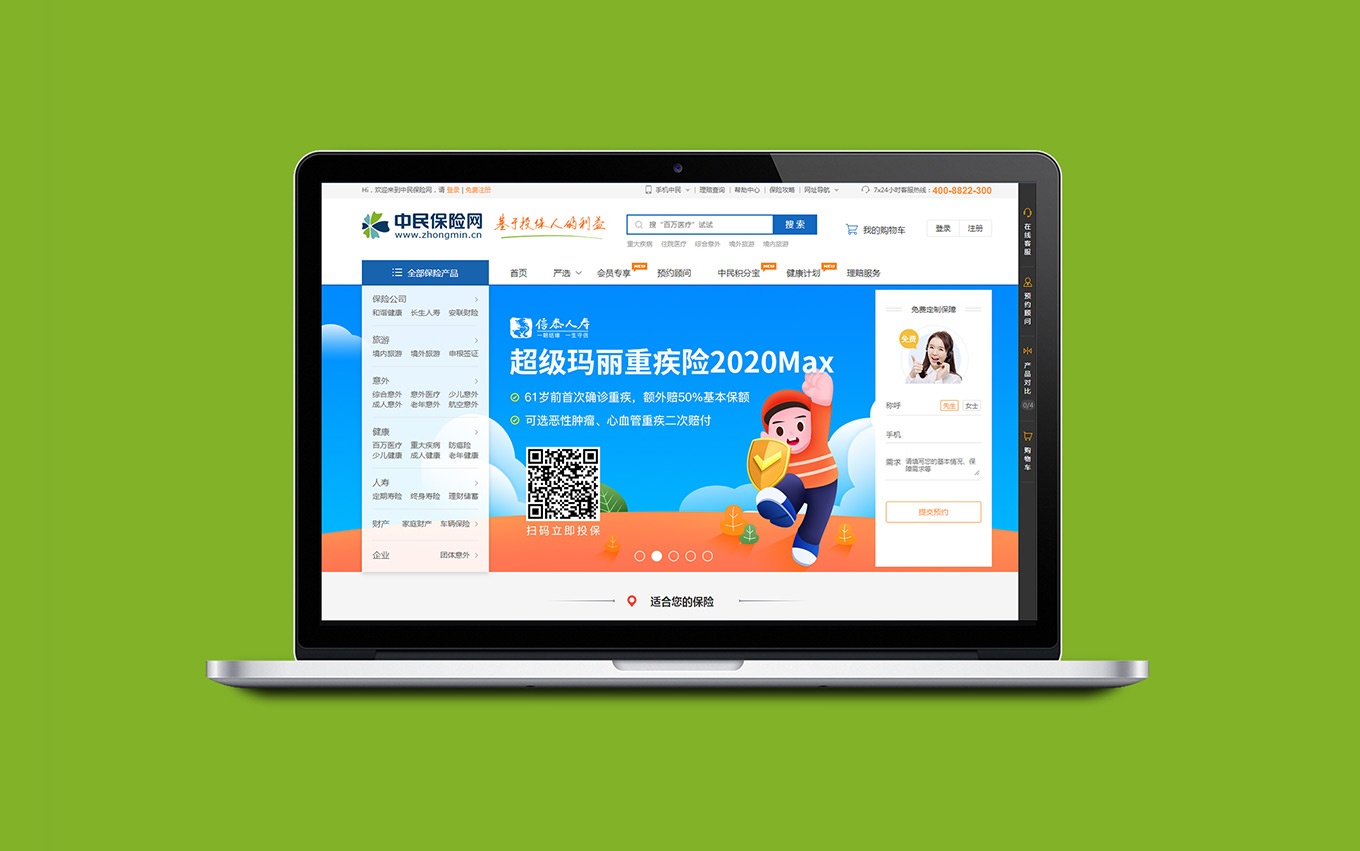 中民保險網是站在投保人的角度、滿足投保人需求的主動型保險電子商務平臺,產品豐富、險種齊全,在線銷售100+國內外著名保險公司2,000+保險產品,包括意外險、旅游險、家財險、健康險、壽險、車險等。目前已經完全實現這些保險產品的在線保費計算、對比、購買、支付與投保功能。